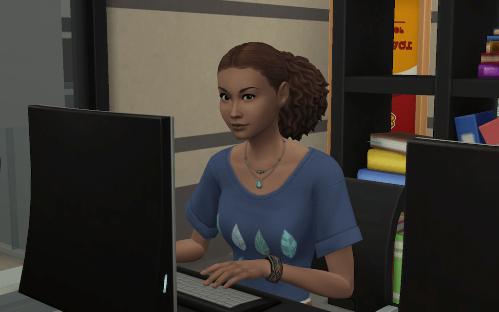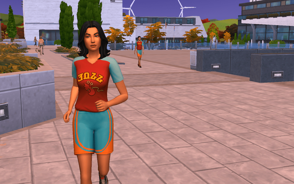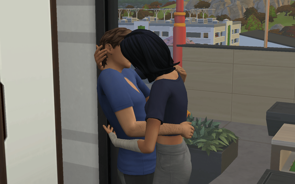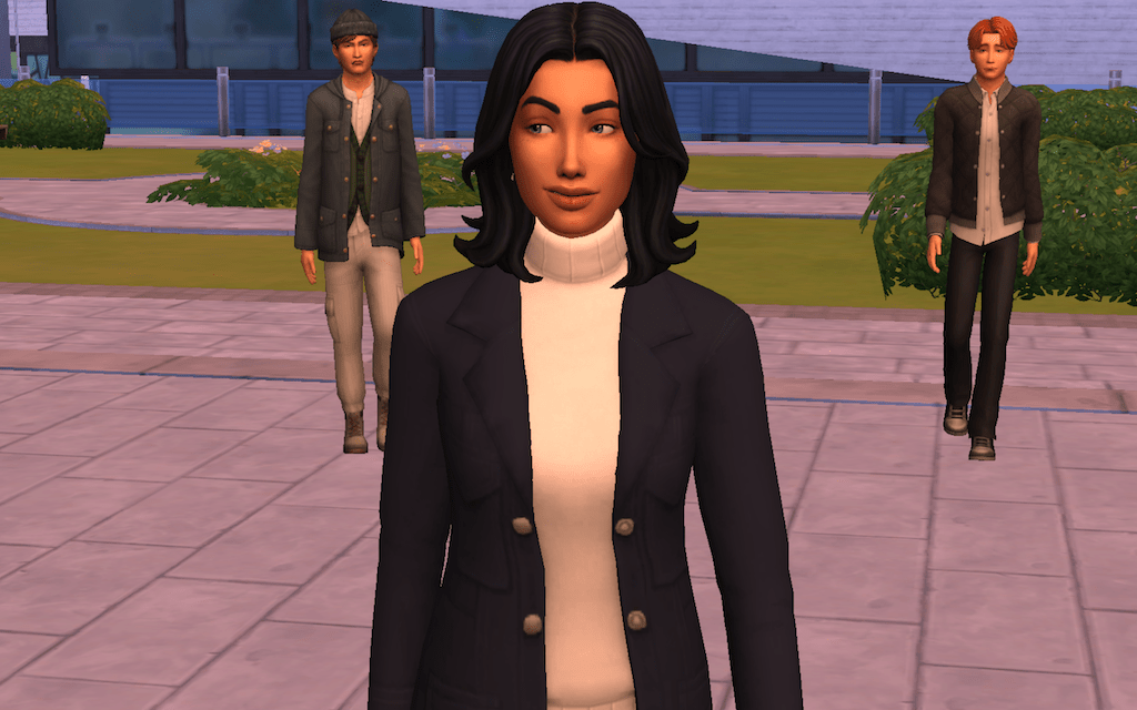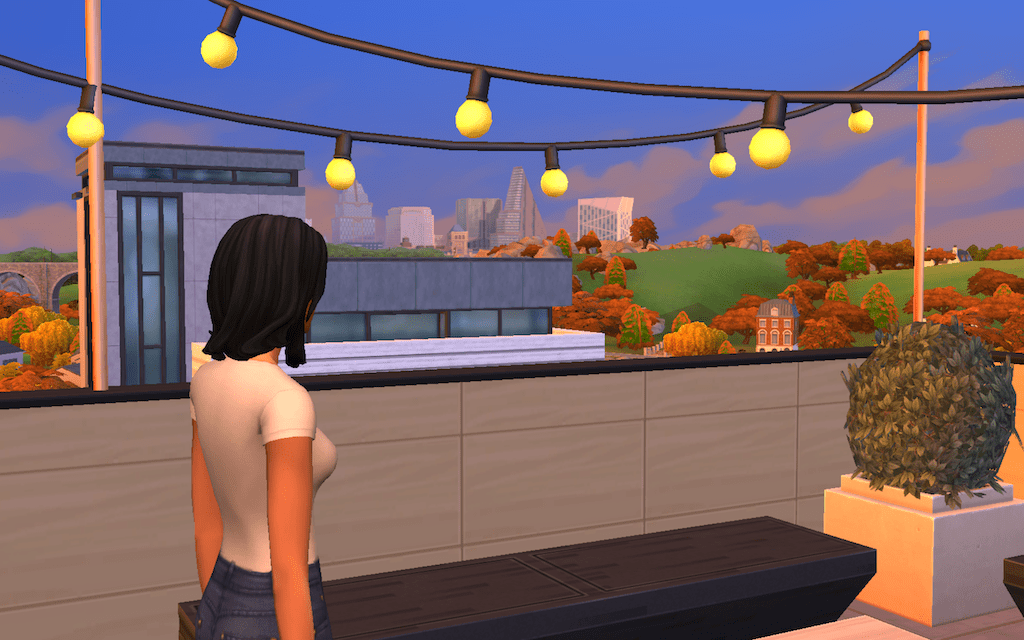 One afternoon, Cora is standing on the dormitory terrace, looking towards the San Myshuno skyline.