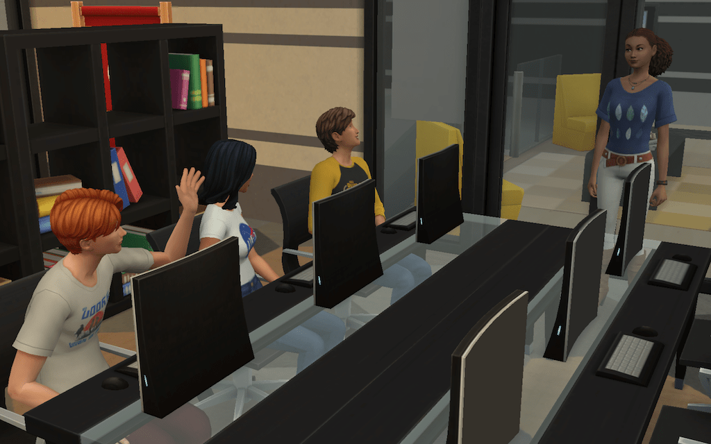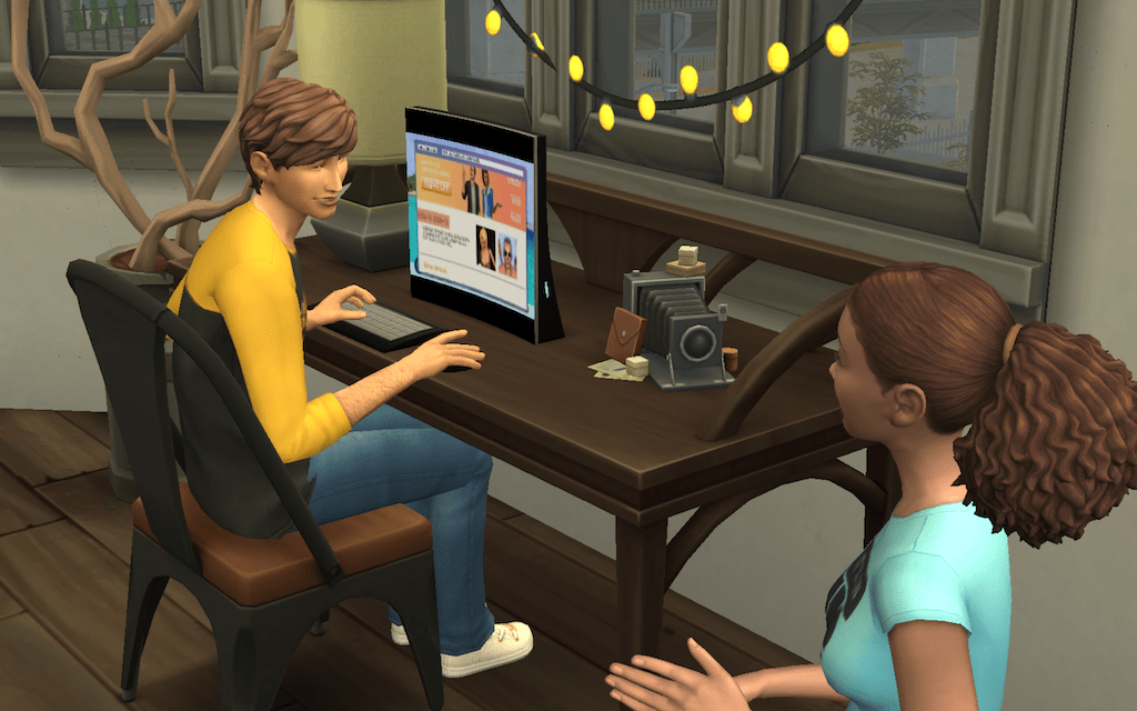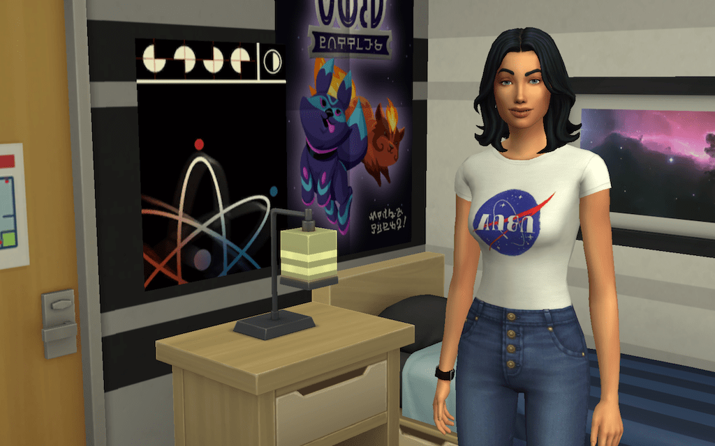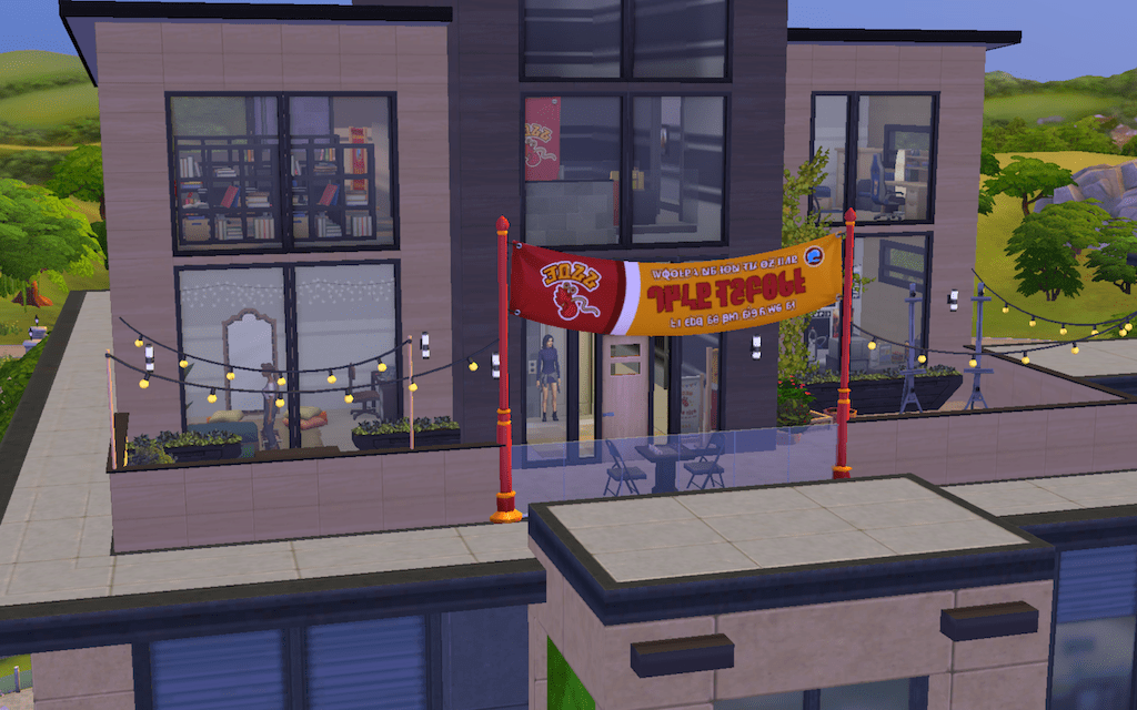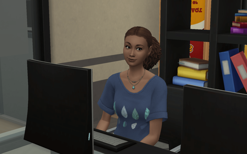 One afternoon, Cora is standing on the dormitory terrace, looking towards the San Myshuno skyline.