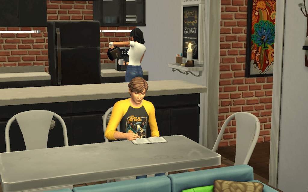 Back home, Aidan is taking a break from his studies to write another short story. His fish Teddy looks on.