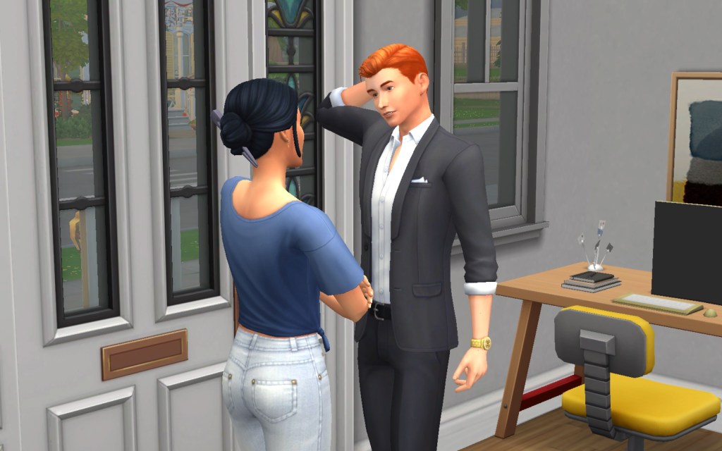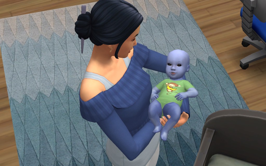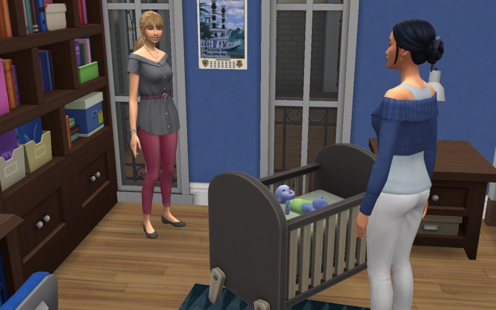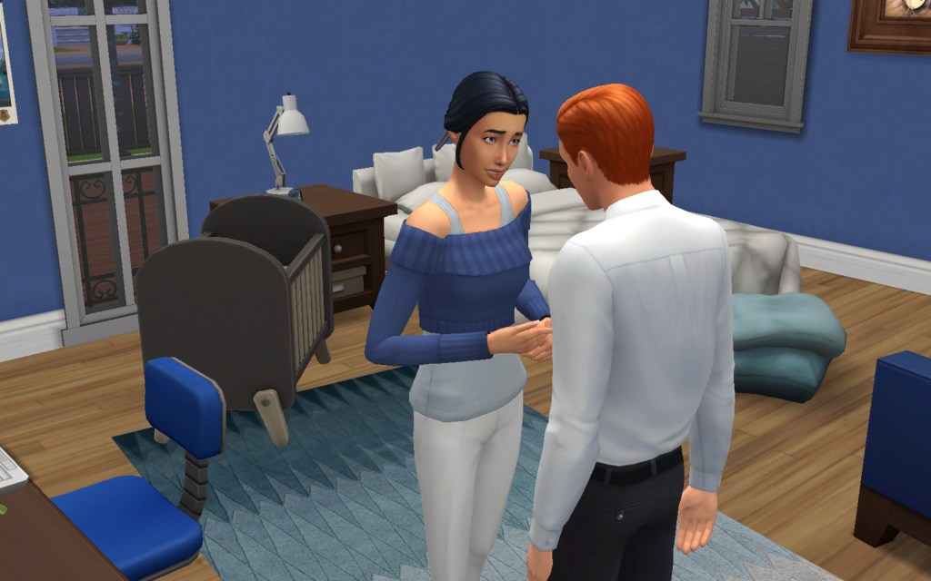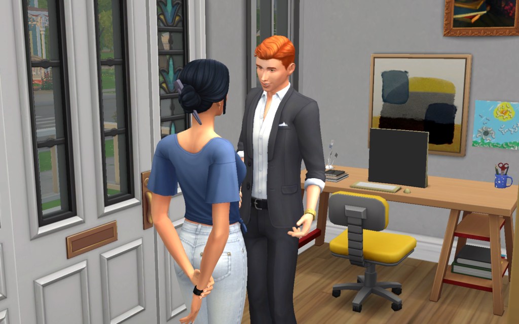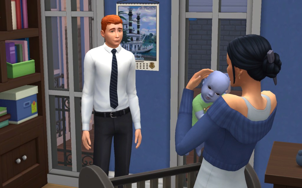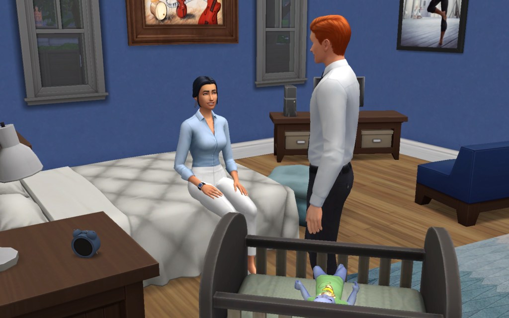 Cora also gets updated on the office drama. Her colleague Elsa thought she was too old to have more kids, but suddenly found herself pregnant and gave birth to a little girl – with black hair. Her very blonde husband Lucas was not impressed. A paternity test and two divorces later, Elsa and Cora’s supervisor Payton now live in a San Myshuno apartment with their baby daughter.