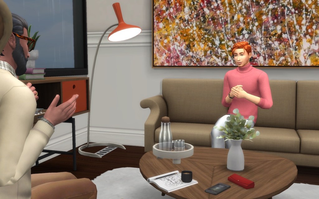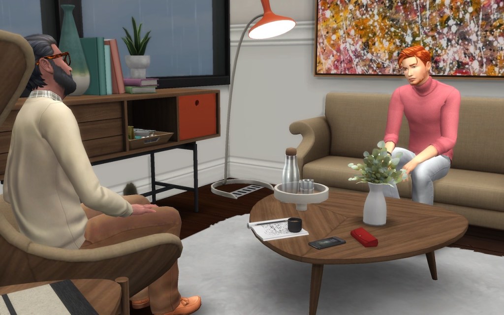 “Don’t be too hard on yourself, Eric. You were only 23, you had a lot to deal with, and postpartum depression in men is woefully under-diagnosed, I’m afraid. But now that you’re doing better, what are your long-term goals? What do you want out of life? What about finding love?”