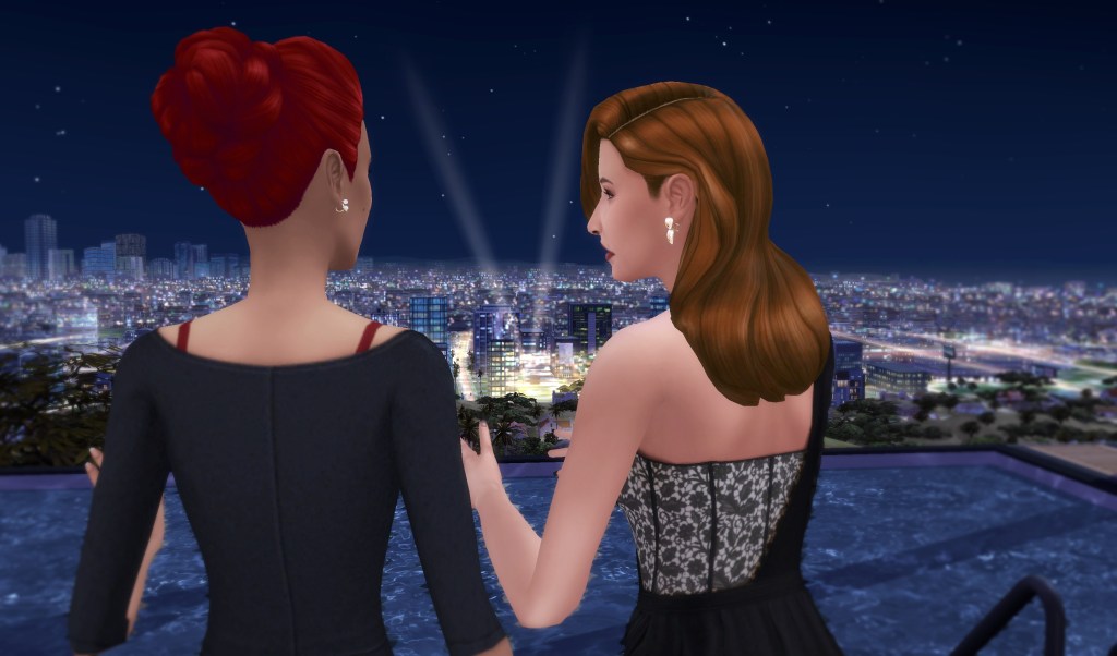 The back of Paul’s mansion was the only thing not surrounded by fences, and the view was both breathtaking and terrifying. Bright lights as far as the eye could see, occasional premature fireworks going off, faint background noise from traffic that never stopped. It felt like we were gilded birds in a cage up here, always on display yet forever out of reach.