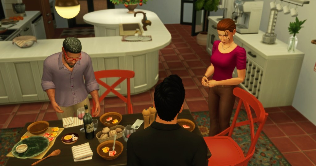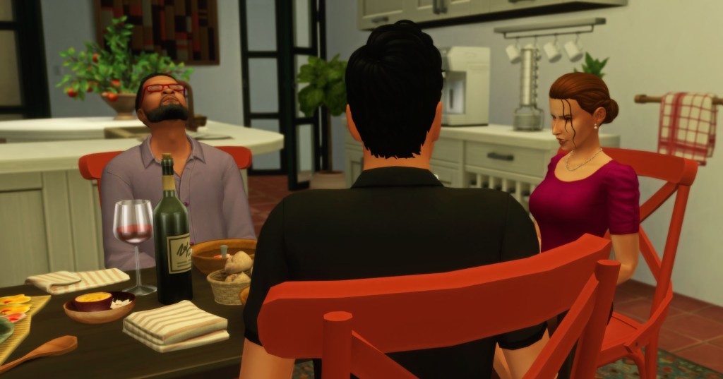 Dave rubs his forehead. “Honey, please, we talked about this. Let the man breathe.”
