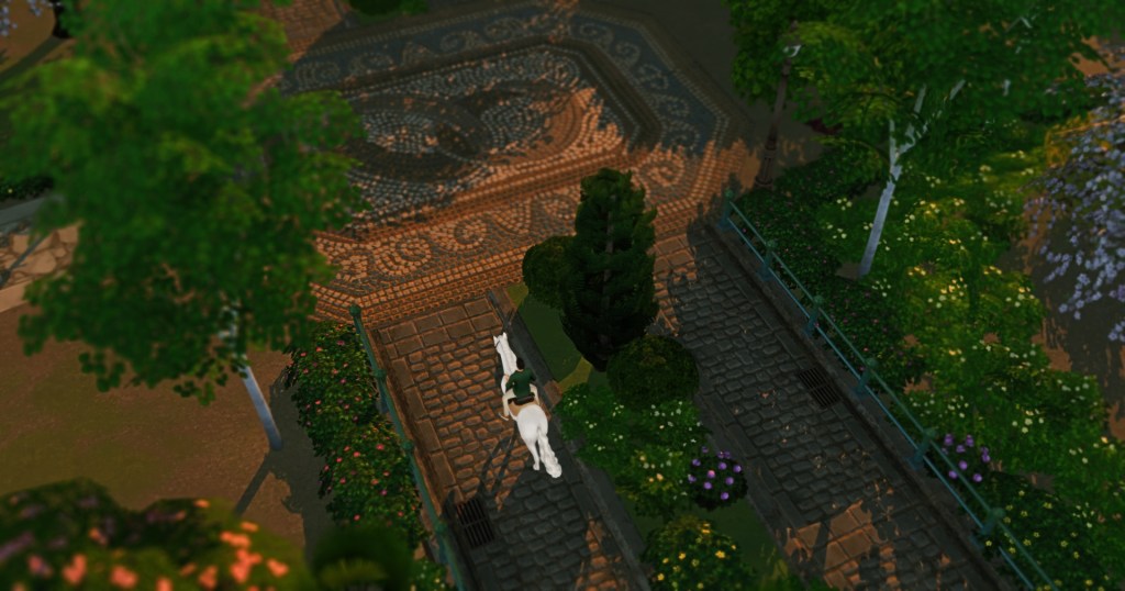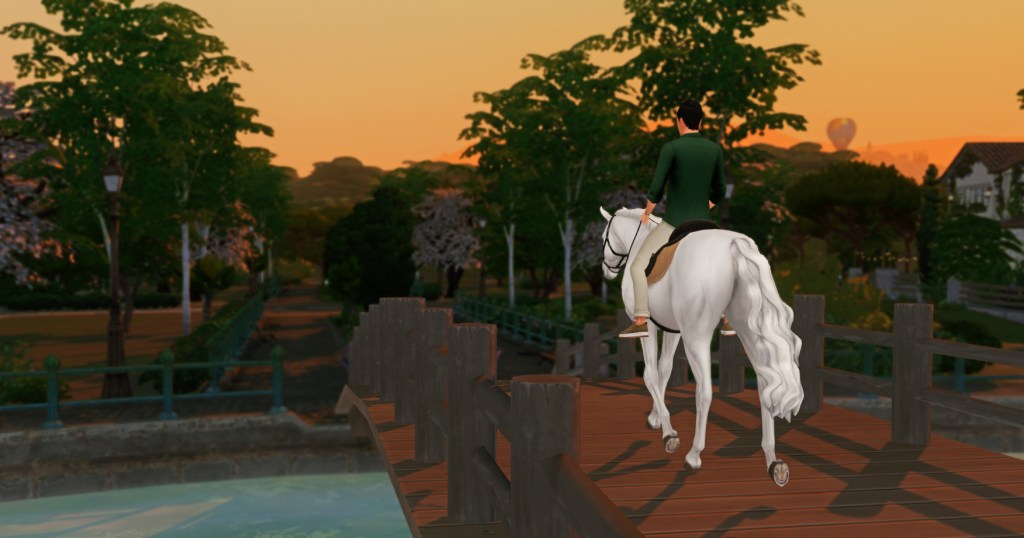Summer is coming to an end, and the warm glow of the early evening bathes everything in gold, casting long shadows and making everything seem almost dreamlike. The sturdy planks of the bridge creak slightly as we cross, the sound blending with the gentle thuds of hooves against wood and the faint rush of the river below. In the distance, the constant song of the waterfalls form a faint, rumbling backdrop.