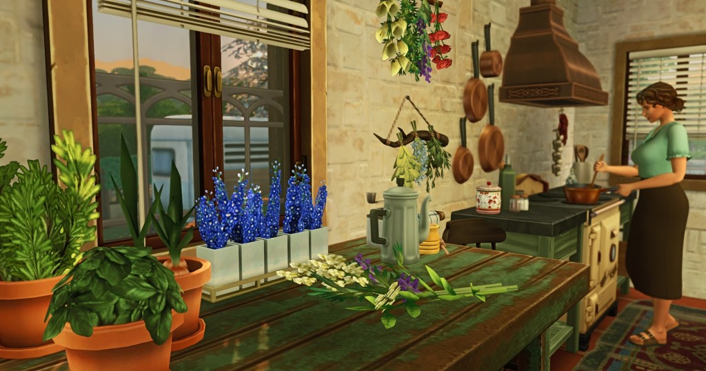 There are herbs everywhere, clay pots of fresh basil and oregano. Recently picked thyme and sage, still with their purple flowers, hangs from the ceiling and fills the air with their fragrance.